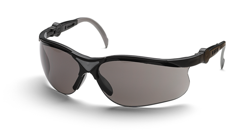 დამცავი სათვალე ნაკაწრების გარეშე, ნაცრისფერი შეფერილობის ლინზებით ულტრაიისფერი სხივებისგან დაცვით, მზიან ამინდში უკეთესი ხედვისთვის. გაფართოების და კუთხის დახრის შესაძლებლობა. აკმაყოფილებს EN 166, ANSI Z87+ სტანდარტების მოთხოვნებს.